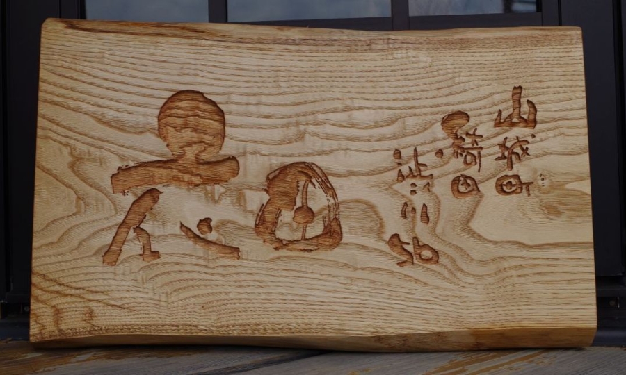 普段の技法はカービングナイフ、彫刻刀、トリマーを使っての彫りですが、毛筆で書いたものをというオーダーでしたので、上記の技法では限界がありサンドブラストを使っての加工です。