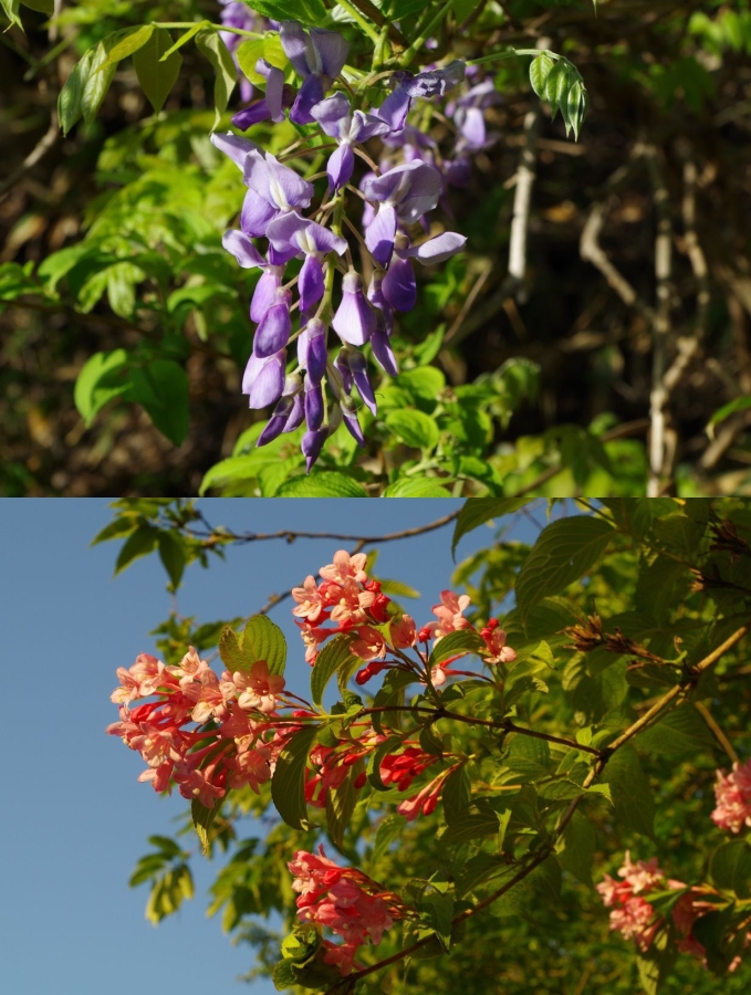 今の季節ありふれた花なのですが「フジ」と「タニウツギ」対象的な花色心惹かれます。