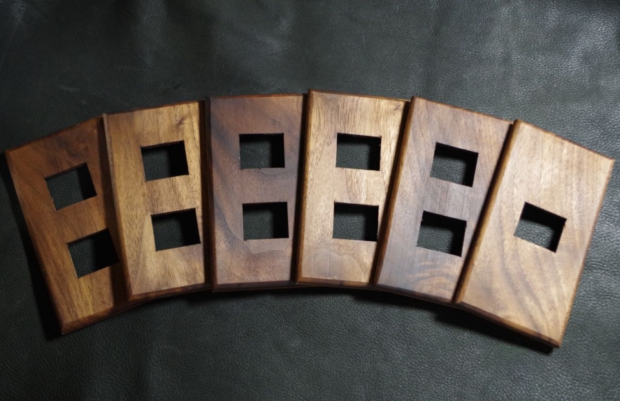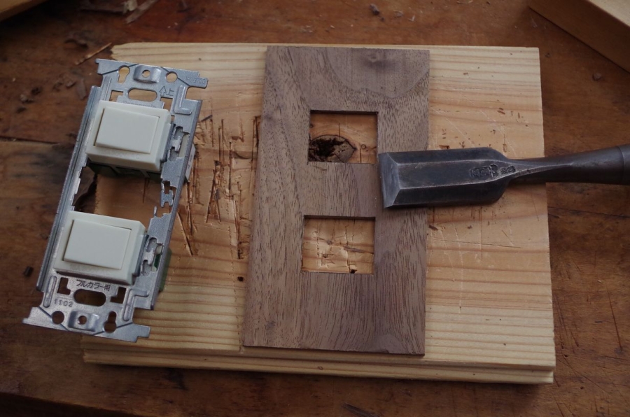 コンセントプレートを7.5mmのプレートをトリマーで金具のスペースを彫り込む方法からベースプレートを3mmにし4.5mmのスペーサーを留で取り付けるやり方に変えてみた。 治具を作り微調整をしまずまずの出来。