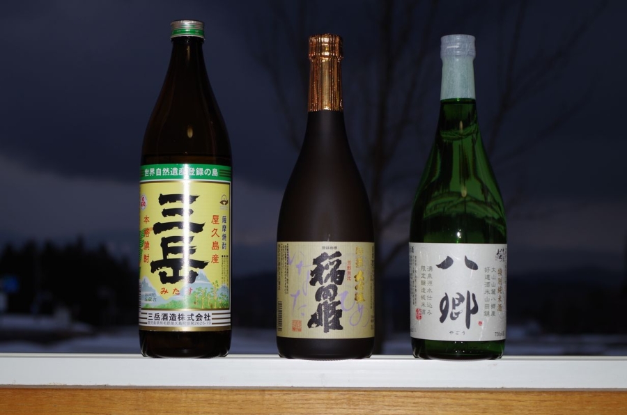 屋久島の「三岳」、地元久米桜酒造「特別純米酒八郷」、米子の稲田本店「特別大吟醸稲田姫」