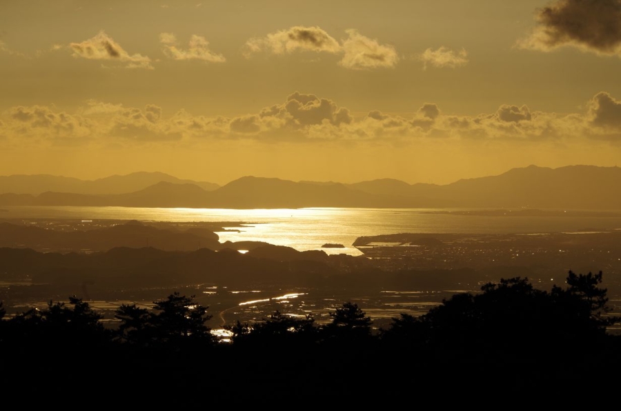 思いがけない落日前の銀色に染まった中海。