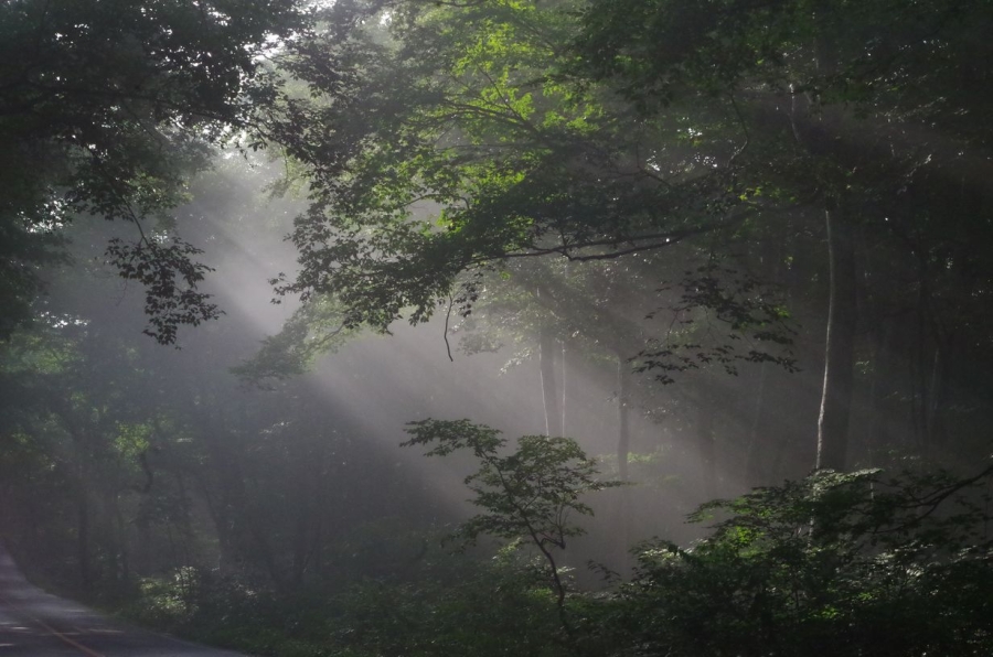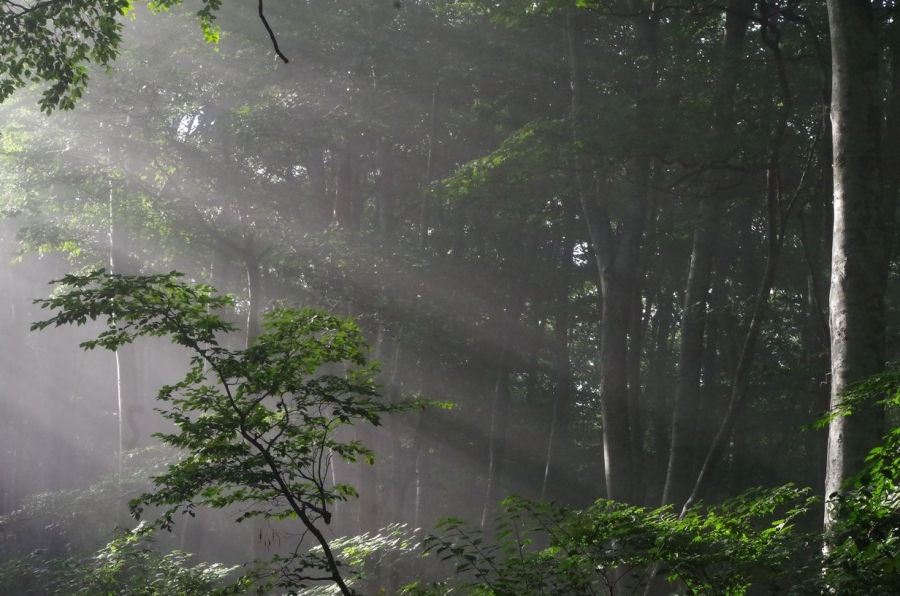 ブナの木立から差し込む木漏れ日。