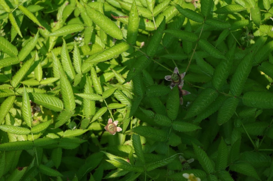 クサイチゴ、モミジイチゴ、クマイチゴ等沢山の野イチゴを見てきましたが、先日某所で初めて見る野イチゴらしきものを発見。