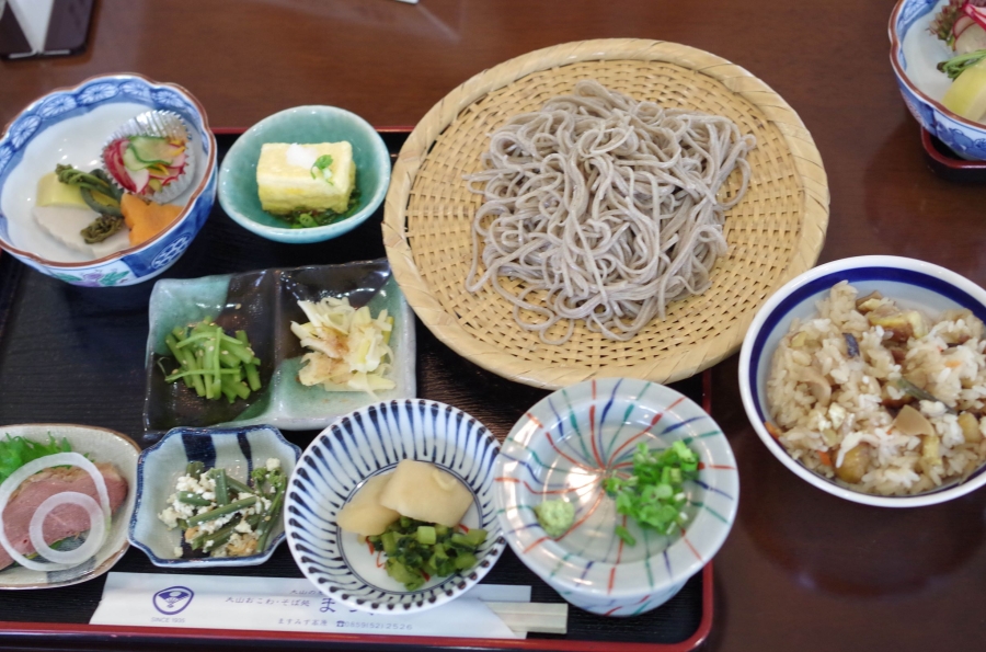 観察会の後、「松岡食堂」で名物大山おこわ、手打ちそば、山菜料理に舌鼓。