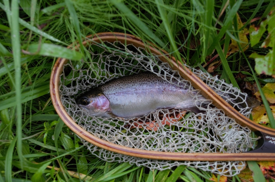 懸命なやり取りの後運よくネットに取り込んだレインボーはたぶん40cm。