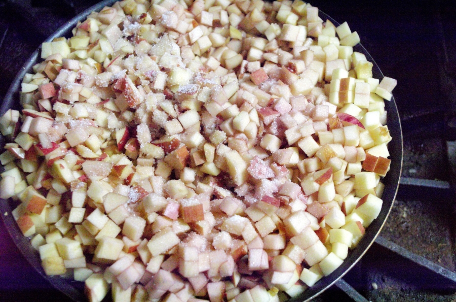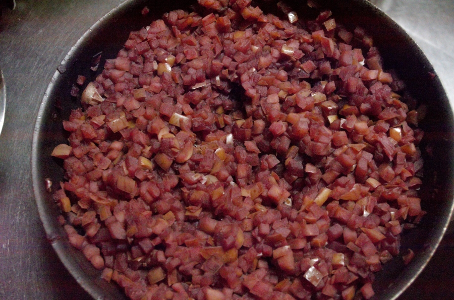 さいの目に切って、赤ワインとラム酒とグラニュー糖でコンフィに。