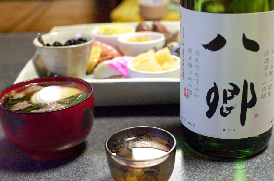 正月のお酒は地元久米桜酒造の特別純米酒「八郷」をいただいています。