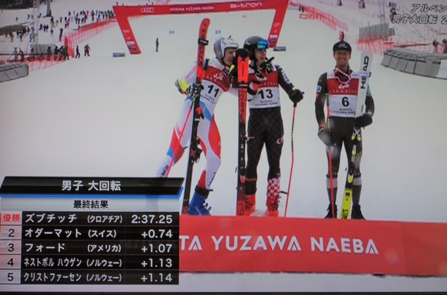 高気温、湿雪のバーンで今シーズンのランク上位の選手が表彰台に上がらない番狂わせのGSとなった。