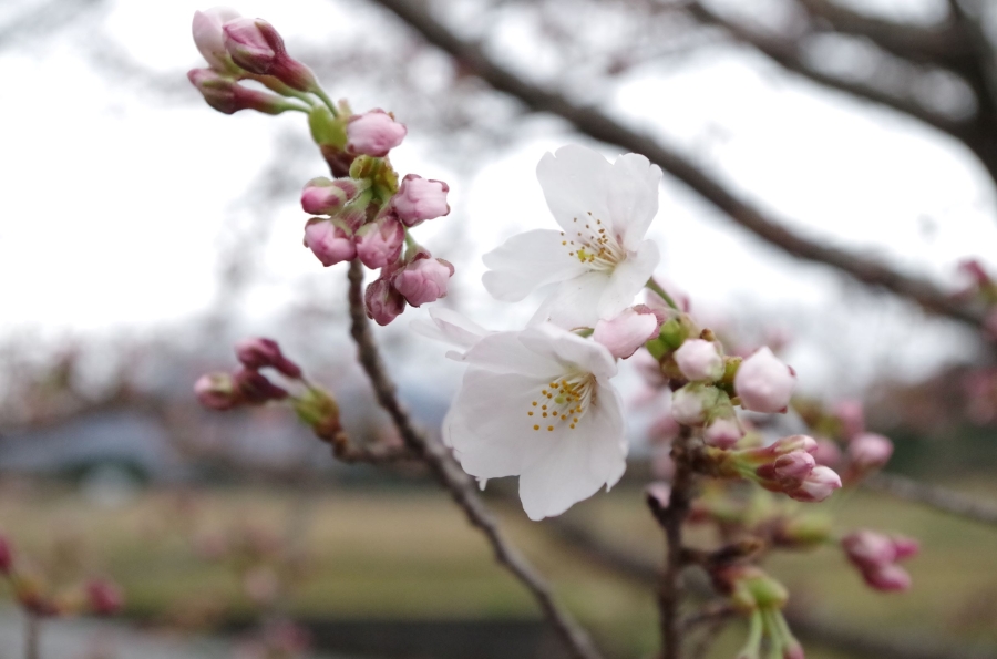 今日は雨模様で画像はいまいちですが我が家の桜開花宣言。