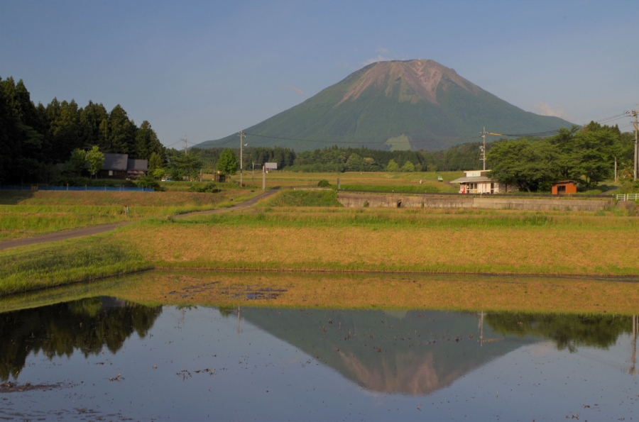この時期ほんの僅かの間に見れる我が家の下の田んぼの逆さ大山。
