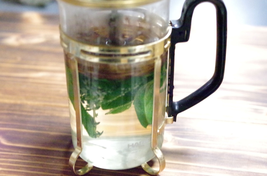 今日は休肝日なので夕食の後久しぶりにハーブティを飲みました(檸檬の葉、スペアミント、タイム、スィートマジョラム)