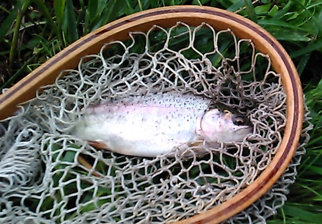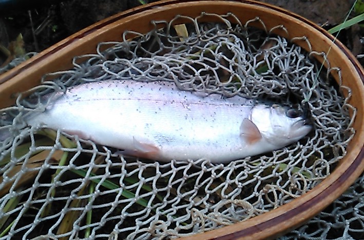 夕まず目の1時間ネットに収めることができたレインボー2匹、大型(?)タカハヤ1匹、取り込み失敗レインボー1匹、ばれたレインボー1匹。