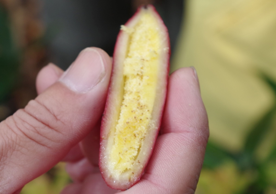 実を半割にしてみると果肉は黄色だが何となくアケビに似ている。