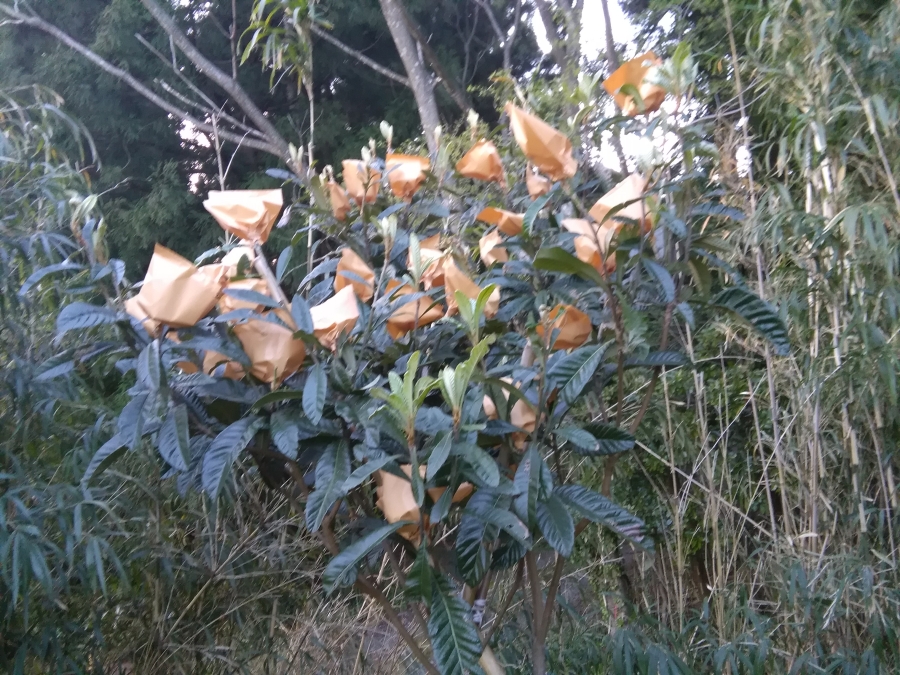 冬の養生は上手くいったようで枝も折れずそこそこ実をつけているのでマー坊に教えてもらい摘果し袋掛けしました。