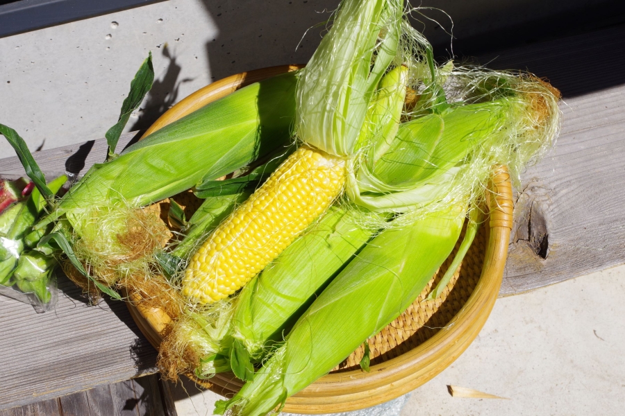 今朝採れのトウモロコシは生で。