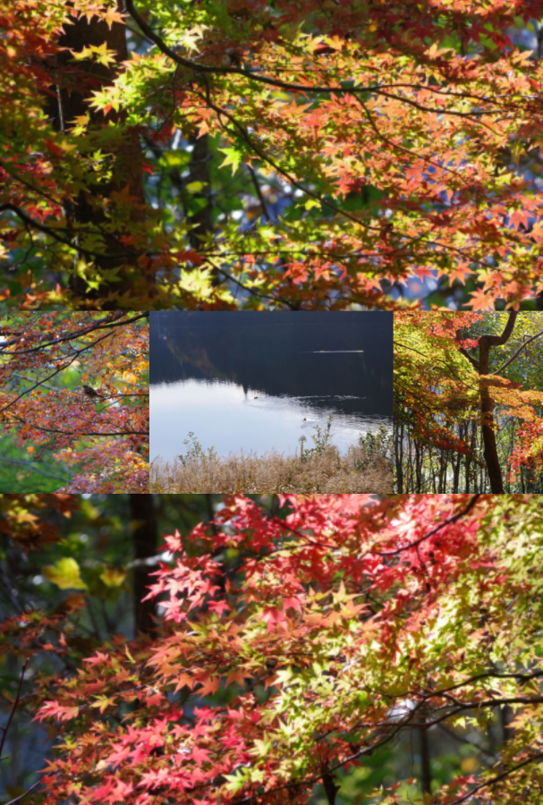 ヤマモミジの紅葉とそのモミジの木に飛び交うアトリ、穏やかな湖面に浮かぶ水鳥に心癒されました。