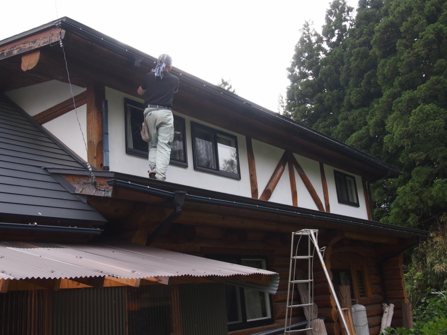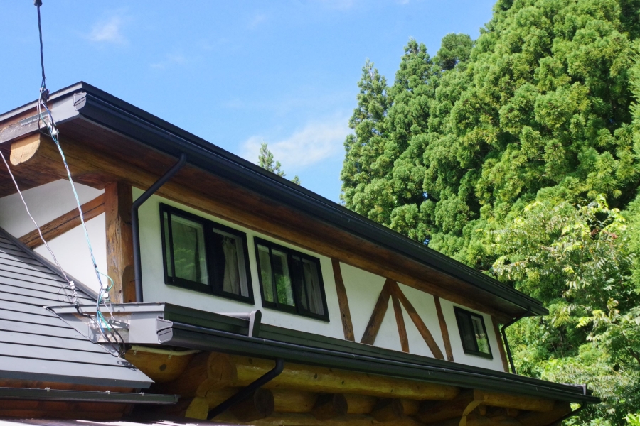 我が家のログハウスは、金具を受け式から吊り式のものにして雪の負荷がかかった時はあえてはずれてダメージを防ぐという考え方で取り付けましたが、シーズン中は雨樋に残ったが氷化した雪を取り除いたり、外れた雨樋を金具に取り付けたり、雪解けとともに破損した雨樋を取り換えるなど高所の作業は大変でした。