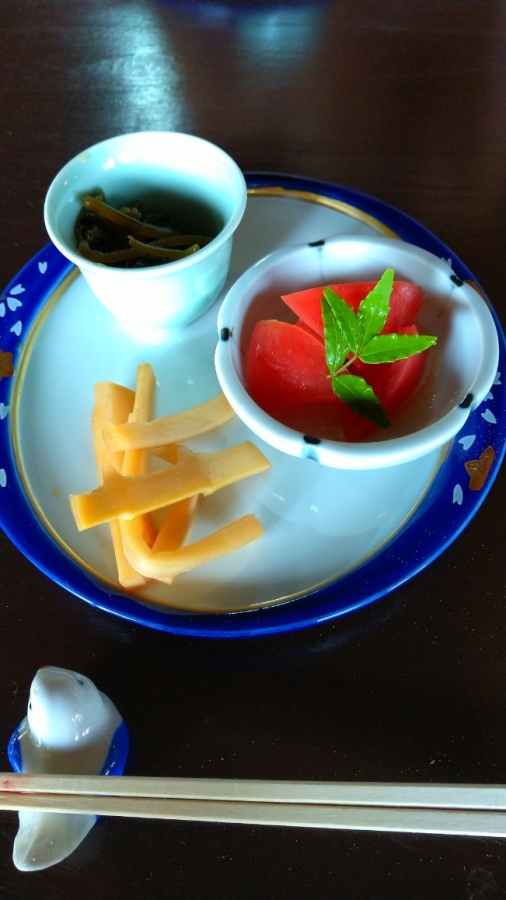 前菜 葉ワサビ、トマト、タケノコの煮物