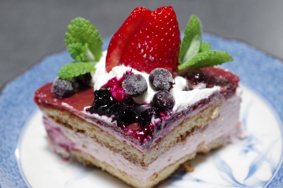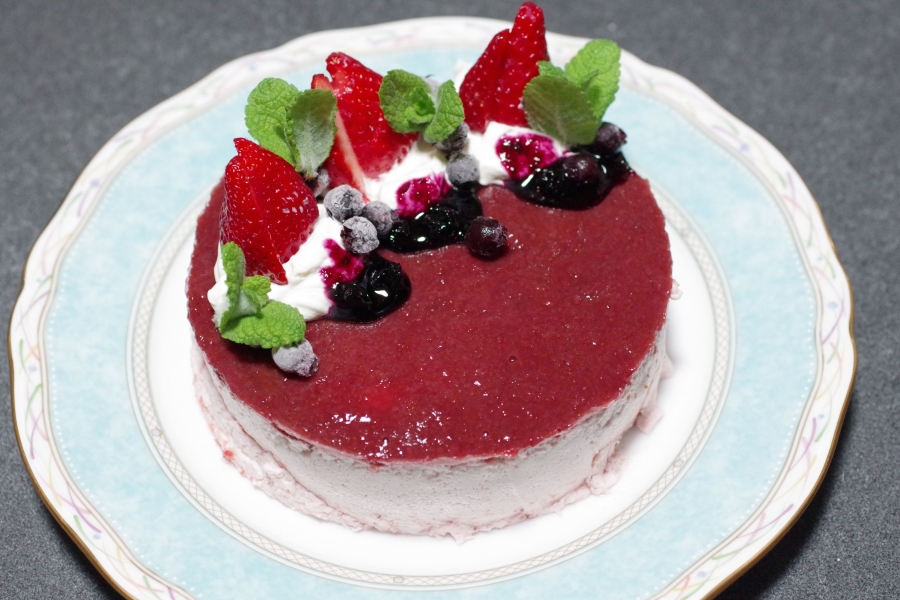 スポンジのデコレーションは少々マンネリ化なので「真っ赤なイチゴのムースケーキ」です。