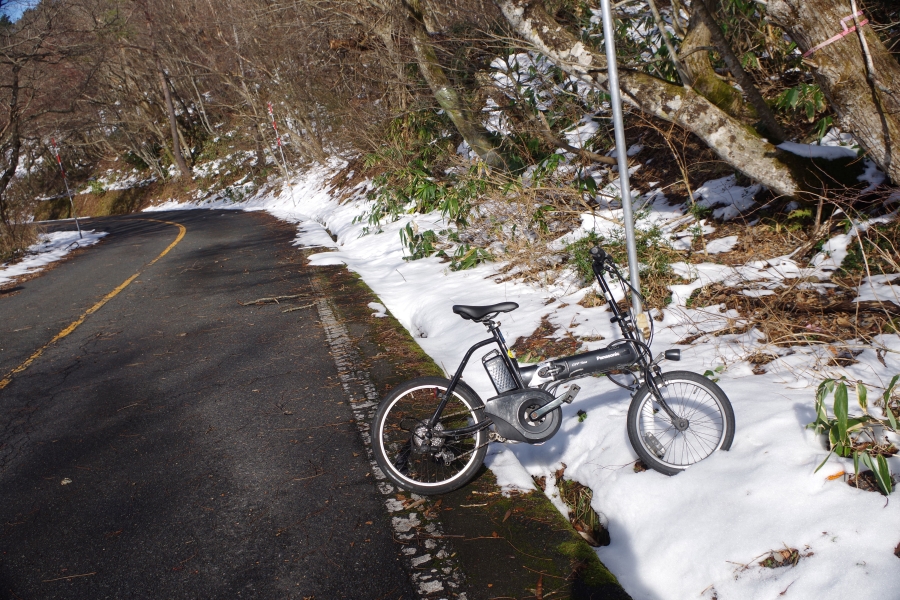 桝水の駐車場でATスキーをリュックに電動自転車のおっちゃん見っけ。