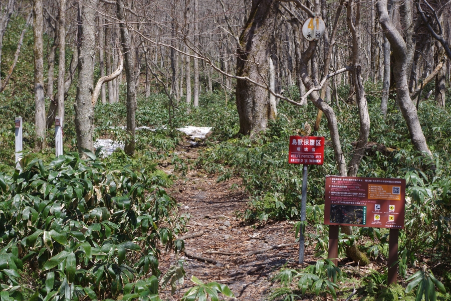 入口には雪はほとんどありませんでしたが、長靴で100mほど登り様子を見ると雪は繋がっていていけそう。