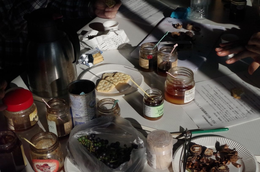 ・元養蜂家でもある良寛先生のによるはちみつコレクションの中から木の実や秋にちなんだはちみつを中心に11種類の試食体験(アボガト、栗、樹液、ニホンハチミツの百科蜜などレアなもの含めて)
